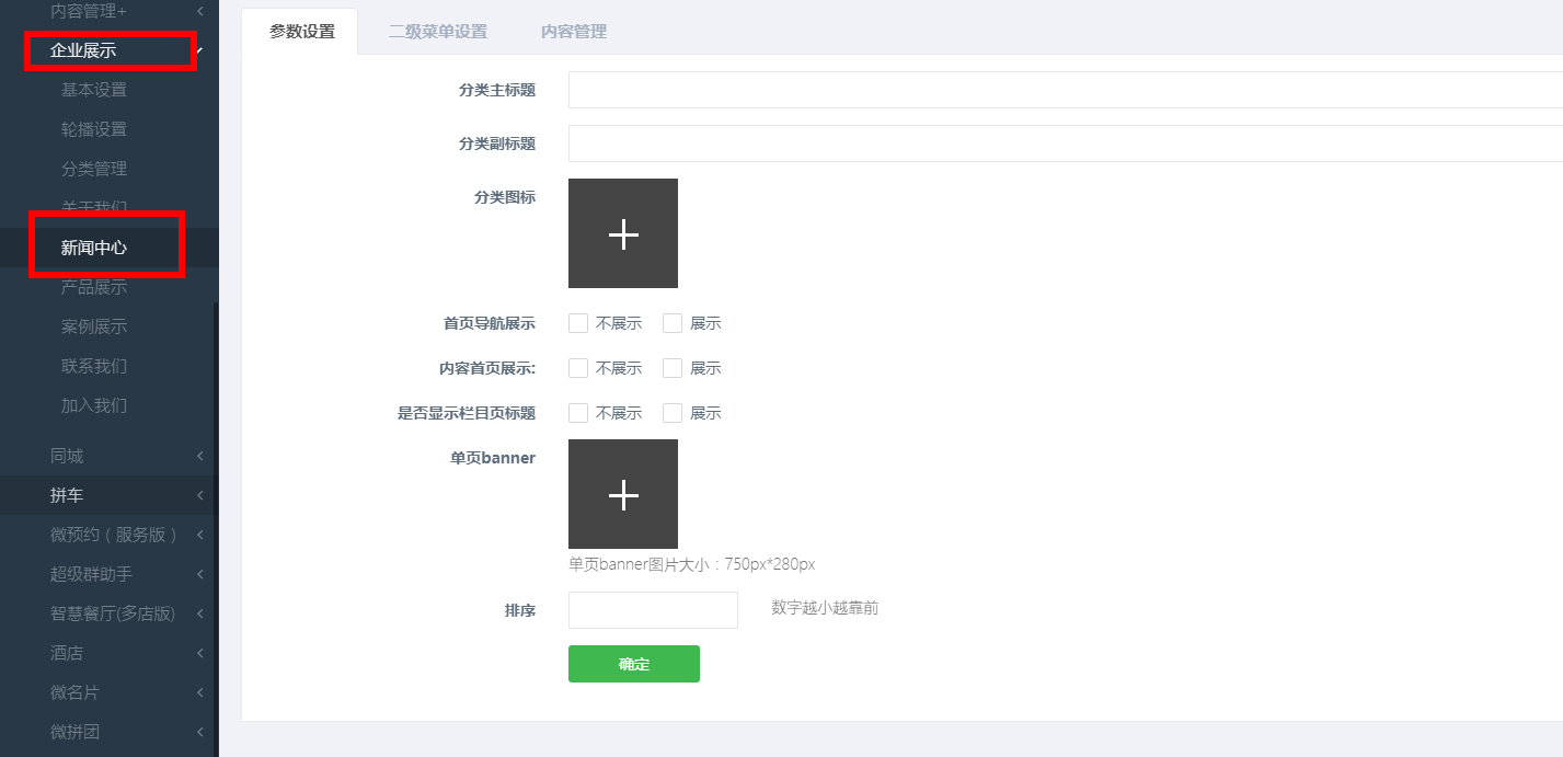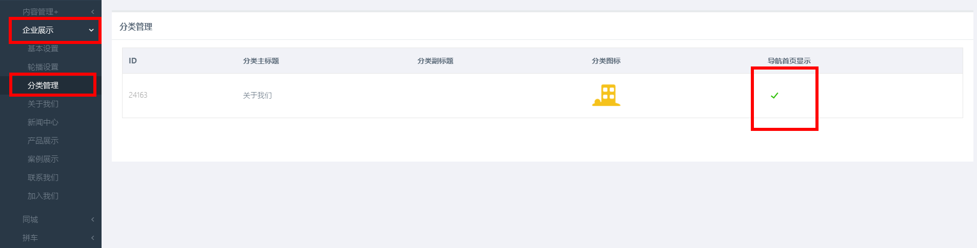 点击左边管理标签栏中【企业展示】->【分类管理】,打开分类管理面板;