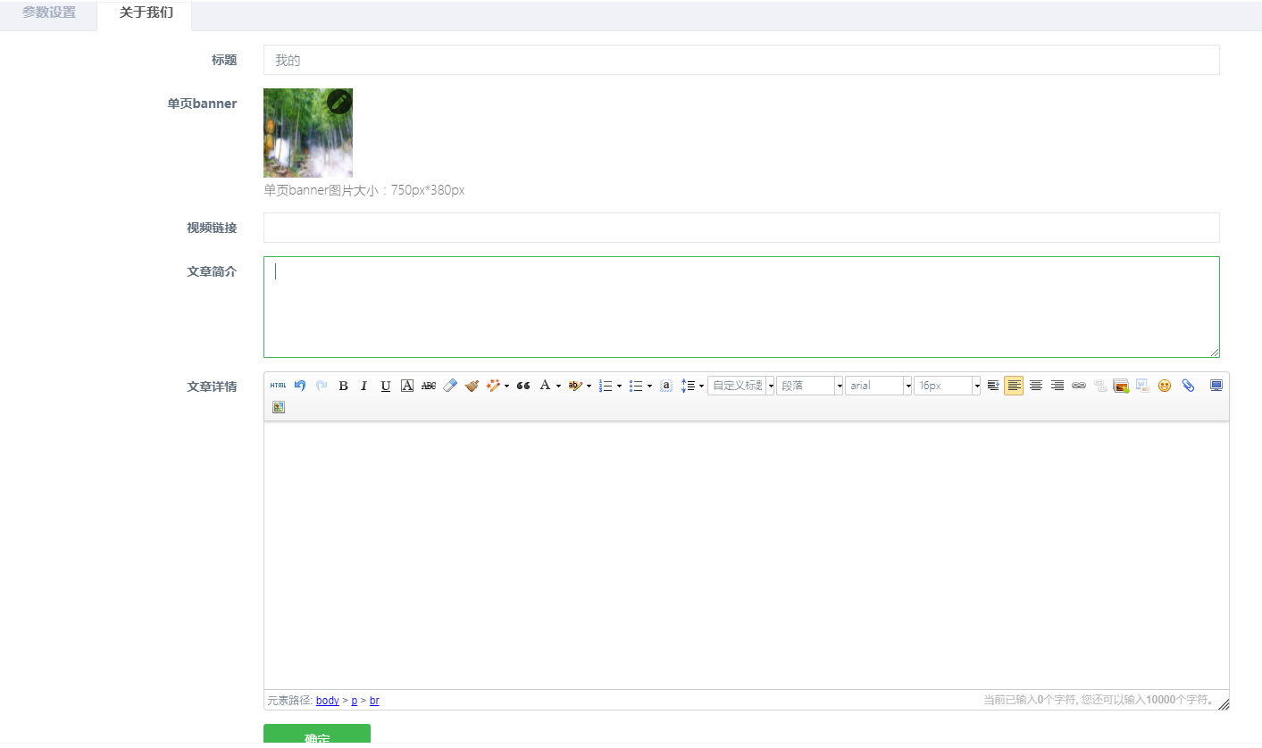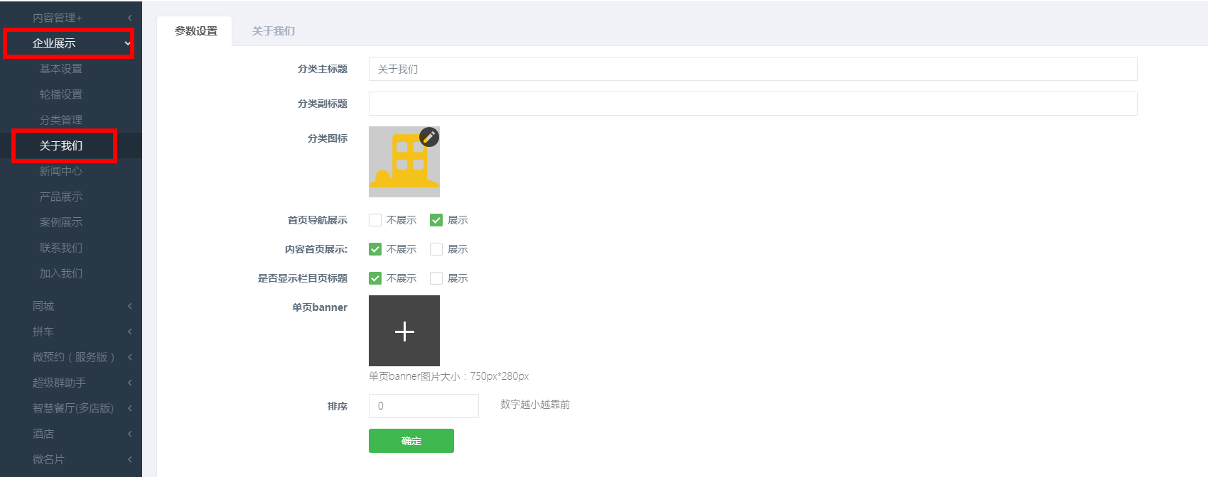 点击左边管理标签栏中【企业展示】->【关于我们】,打开关于我们面板;
