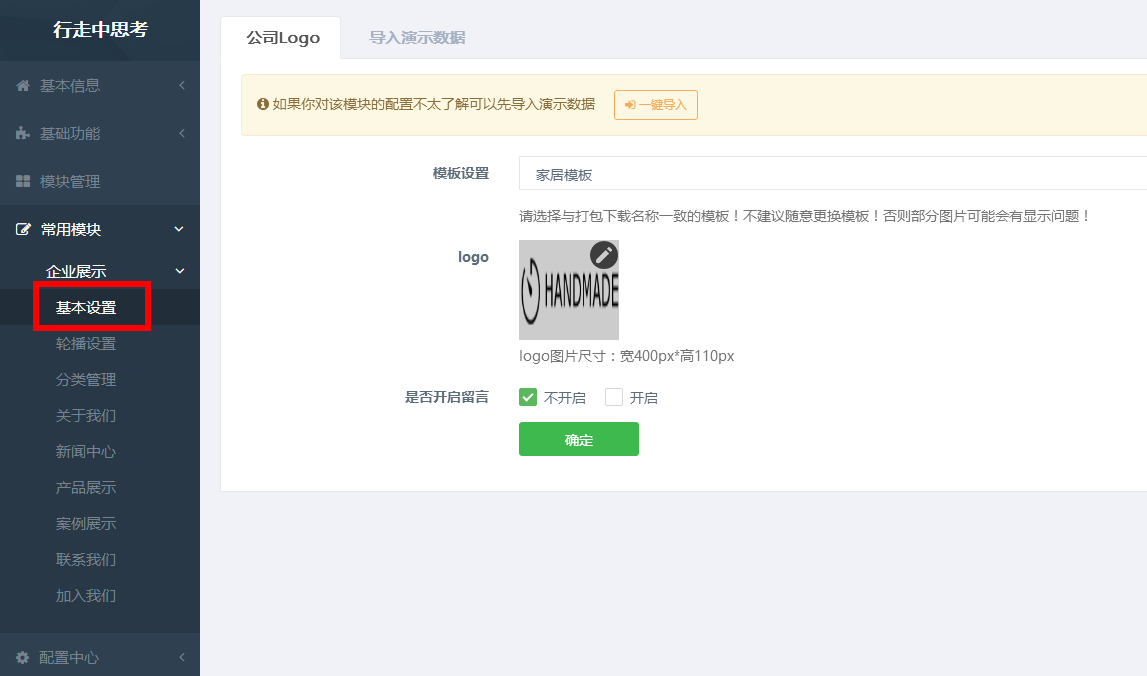 选择模板、上传LOGO,留言开启设置;