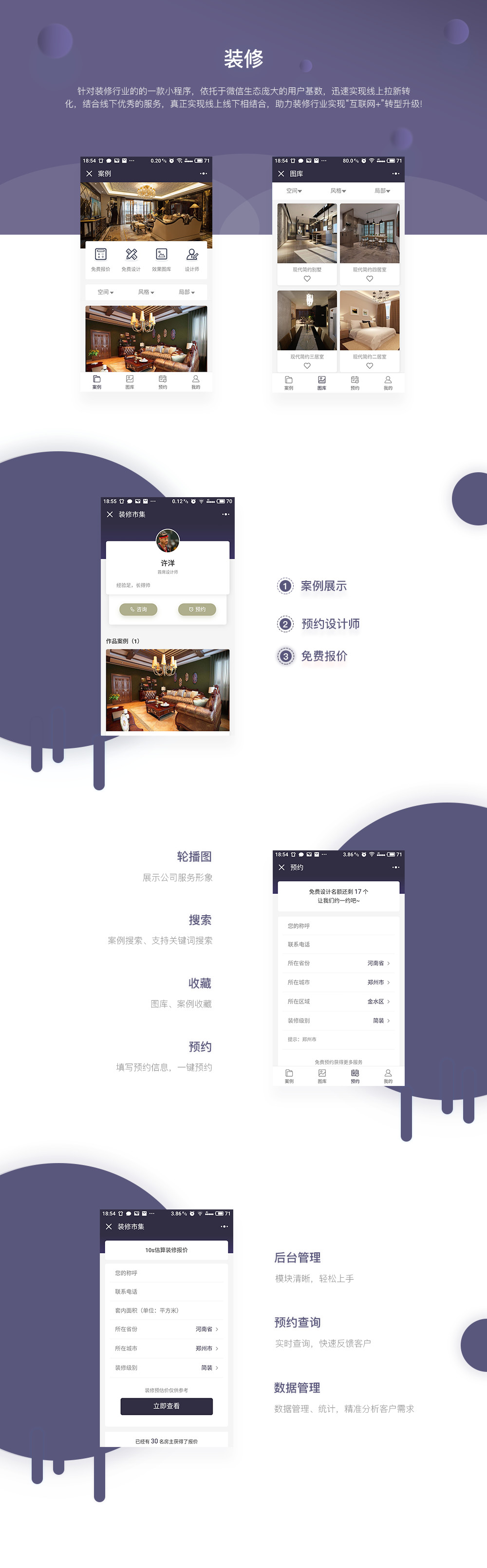 面对装修行业的的一款小程序,可以为客户演示作品案例、精品图库,设计师作品集,全方位展示装修公司形象和设计理念。还可以引导线上用户进行装修预约和报价咨询来获得更多服务,依托于微信生态庞大的用户基数,迅速