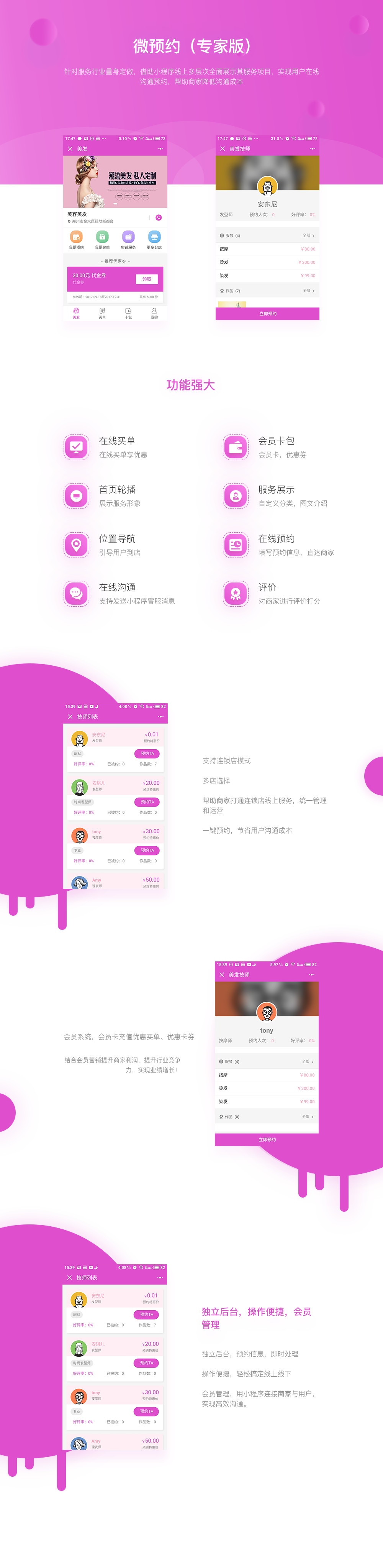 美容美发模块可以到店消费,也可以预约指定技术,并且有会员卡储值功能。